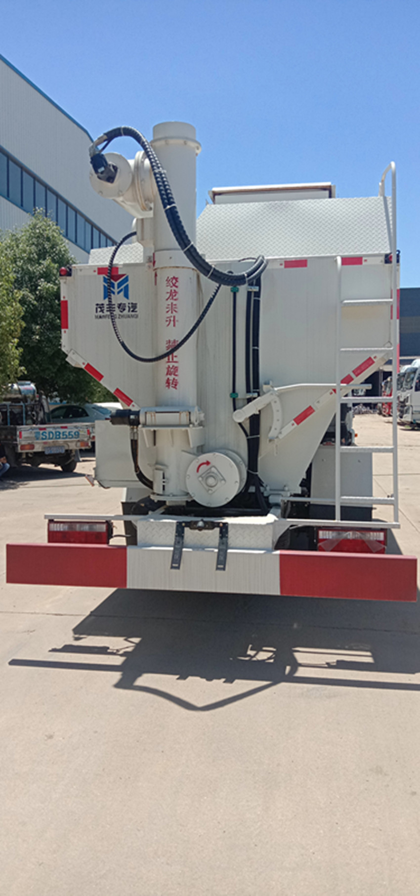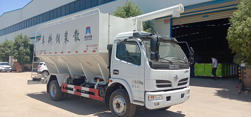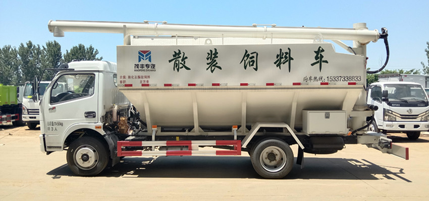 散裝飼料運(yùn)輸車,散裝飼料車的飼料罐架設(shè)在卡車的底盤(pán)上,罐頂開(kāi)有進(jìn)料口.頂部的一根螺旋輸送卸料管(俗稱卸料絞龍)則可自由回轉(zhuǎn)和抬升,抬升的仰角可達(dá)60度。運(yùn)輸時(shí),頂部的螺旋管平臥在罐頂;卸料時(shí)則抬起,使管端的出料口與畜禽飼養(yǎng)場(chǎng)貯料罐頂部的進(jìn)料門(mén)相接,駕駛室內(nèi)裝有操縱裝置(操縱裝置也可裝置在罐體尾部),卸料時(shí)通過(guò)車底的動(dòng)力輸出軸和減速器來(lái)驅(qū)動(dòng)螺旋,以完成卸料。