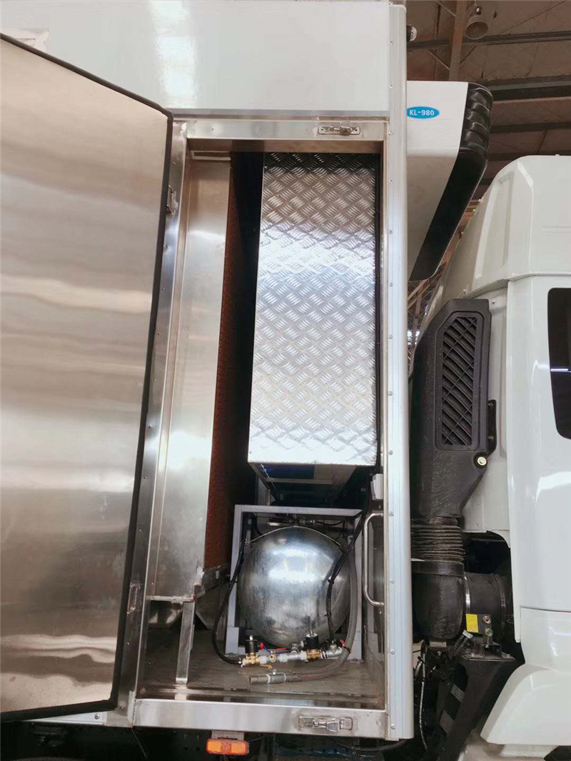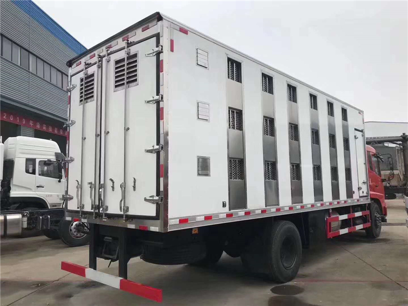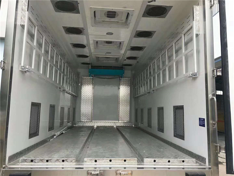 【豬苗車】上裝配置:外玻璃鋼,內(nèi)不銹鋼,兩層液壓升降層板,尾部液壓翻轉(zhuǎn)上豬平臺,層板為不銹鋼骨架鋪鋁花紋板。外部電動升降窗,排氣扇,柴油發(fā)電機(jī),暖風(fēng)加熱,喂水系統(tǒng),凈水箱、污水箱,箱內(nèi)攝像頭監(jiān)控,倒車影像,凱利制冷機(jī)組。(油暖加熱為選裝部件)