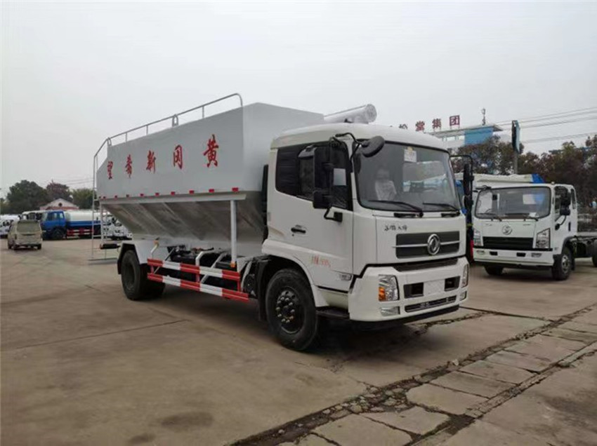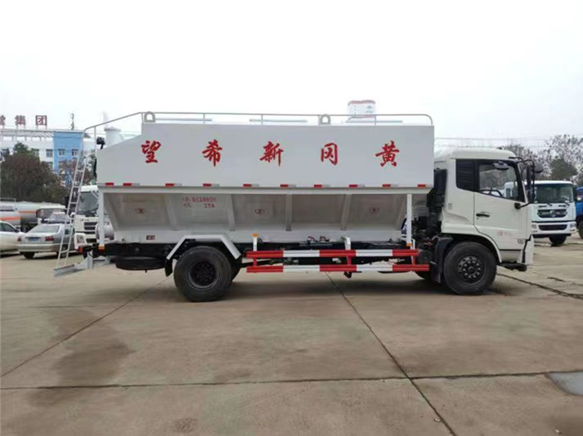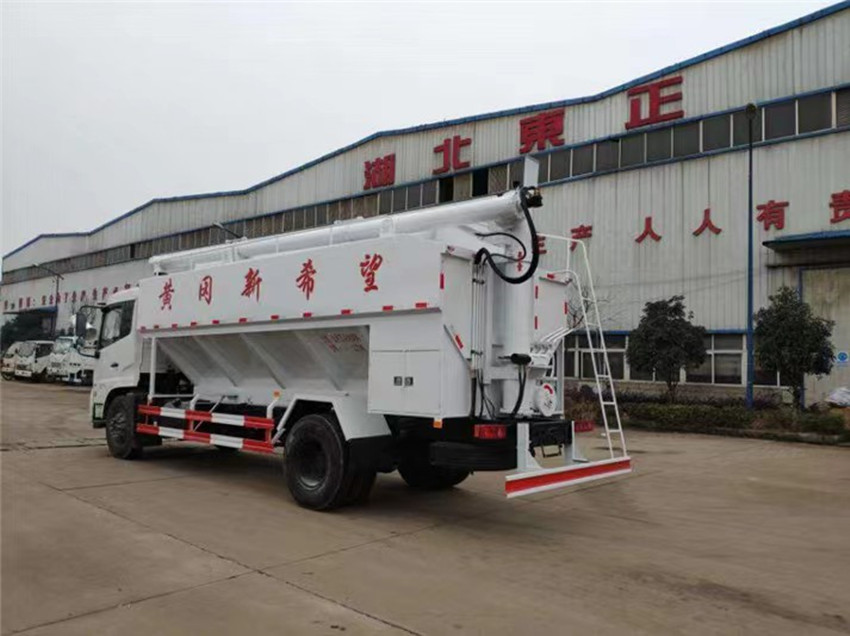 散裝飼料運(yùn)輸車,散裝飼料車的飼料罐架設(shè)在卡車的底盤上,罐頂開有進(jìn)料口.頂部的一根螺旋輸送卸料管(俗稱卸料絞龍)則可自由回轉(zhuǎn)和抬升,抬升的仰角可達(dá)60度。運(yùn)輸時(shí),頂部的螺旋管平臥在罐頂;卸料時(shí)則抬起,使管端的出料口與畜禽飼養(yǎng)場(chǎng)貯料罐頂部的進(jìn)料門相接,駕駛室內(nèi)裝有操縱裝置(操縱裝置也可裝置在罐體尾部),卸料時(shí)通過(guò)車底的動(dòng)力輸出軸和減速器來(lái)驅(qū)動(dòng)螺旋,以完成卸料。