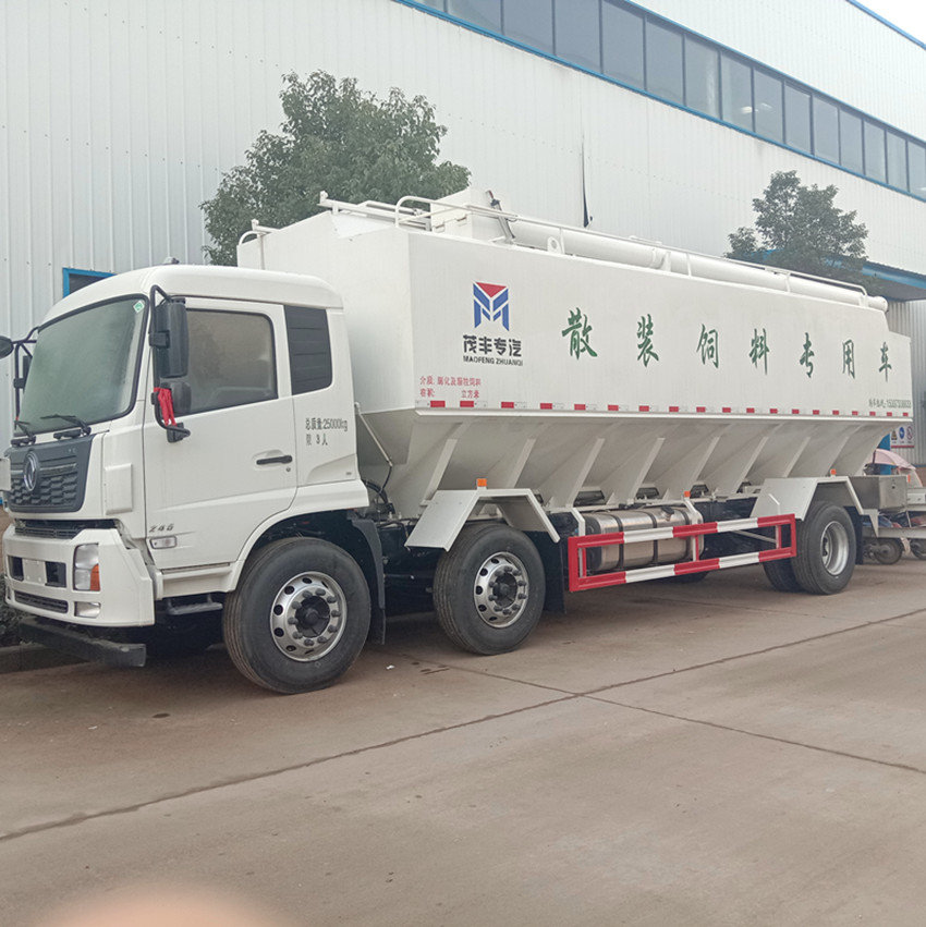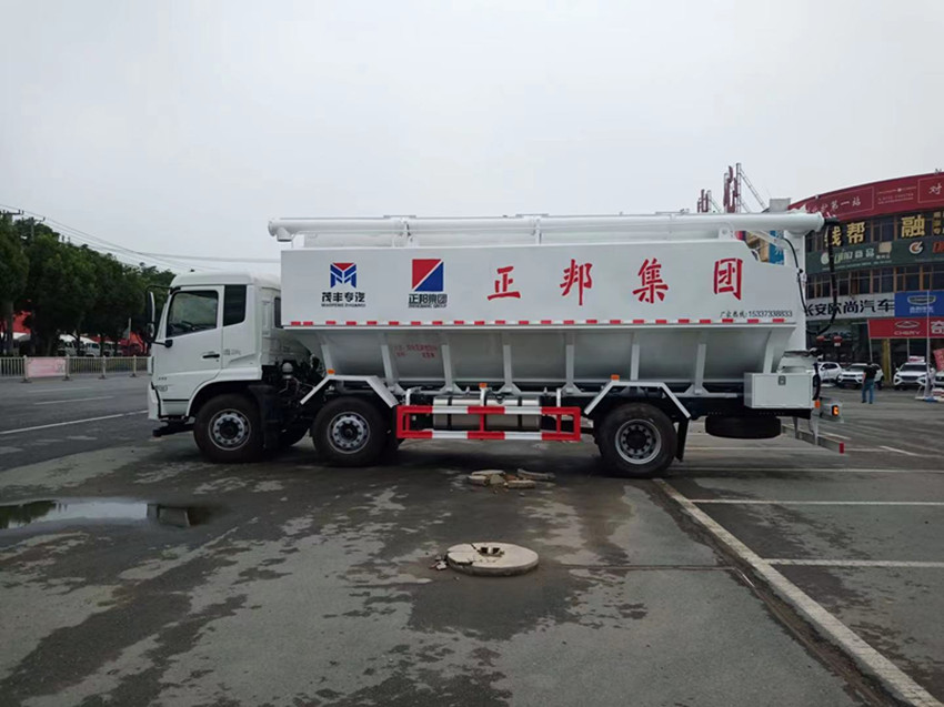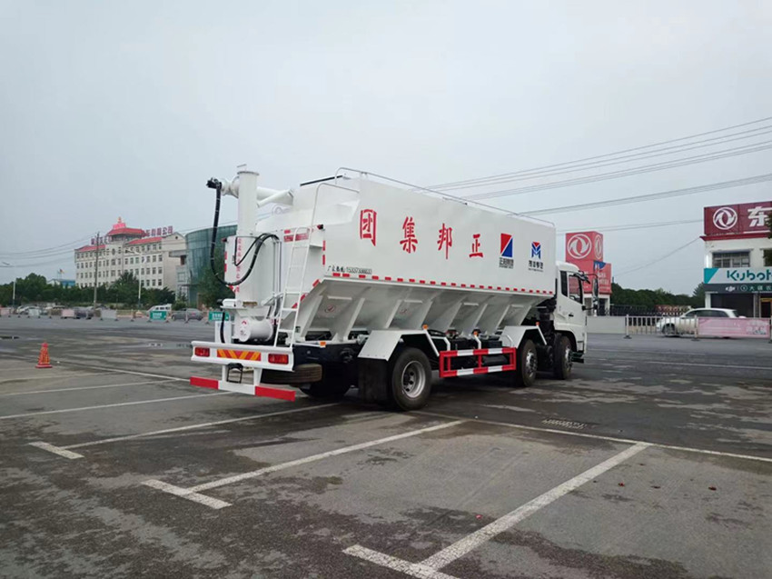 散裝飼料運輸車,散裝飼料車的飼料罐架設在卡車的底盤上,罐頂開有進料口.頂部的一根螺旋輸送卸料管(俗稱卸料絞龍)則可自由回轉和抬升,抬升的仰角可達60度。運輸時,頂部的螺旋管平臥在罐頂;卸料時則抬起,使管端的出料口與畜禽飼養(yǎng)場貯料罐頂部的進料門相接,駕駛室內裝有操縱裝置(操縱裝置也可裝置在罐體尾部),卸料時通過車底的動力輸出軸和減速器來驅動螺旋,以完成卸料。
