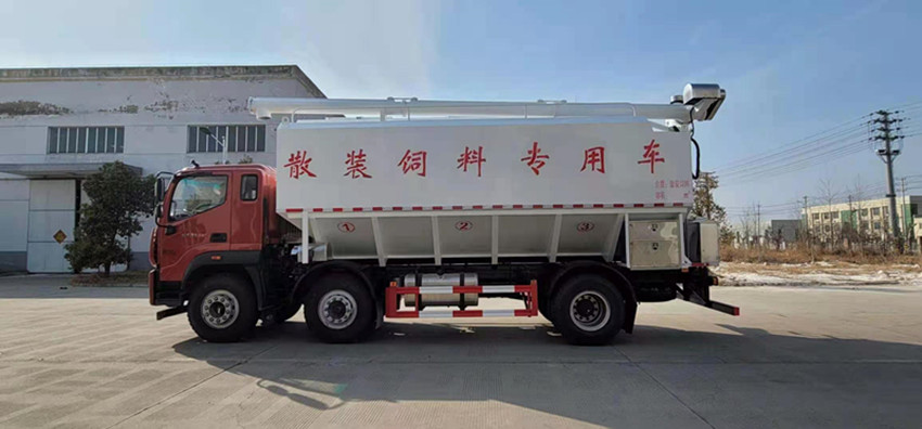 散裝飼料運輸車,散裝飼料車的飼料罐架設在卡車的底盤上,罐頂開有進料口.頂部的一根螺旋輸送卸料管(俗稱卸料絞龍)則可自由回轉和抬升,抬升的仰角可達60度。運輸時,頂部的螺旋管平臥在罐頂;卸料時則抬起,使管端的出料口與畜禽飼養(yǎng)場貯料罐頂部的進料門相接,駕駛室內裝有操縱裝置(操縱裝置也可裝置在罐體尾部),卸料時通過車底的動力輸出軸和減速器來驅動螺旋,以完成卸料。