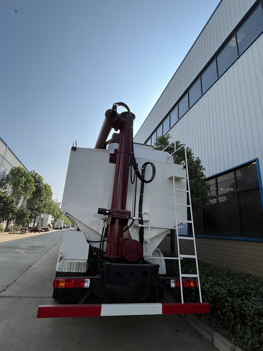 散裝飼料運輸車,散裝飼料車的飼料罐架設(shè)在卡車的底盤上,罐頂開有進料口.頂部的一根螺旋輸送卸料管(俗稱卸料絞龍)則可自由回轉(zhuǎn)和抬升,抬升的仰角可達60度。運輸時,頂部的螺旋管平臥在罐頂;卸料時則抬起,使管端的出料口與畜禽飼養(yǎng)場貯料罐頂部的進料門相接,駕駛室內(nèi)裝有操縱裝置(操縱裝置也可裝置在罐體尾部),卸料時通過車底的動力輸出軸和減速器來驅(qū)動螺旋,以完成卸料。