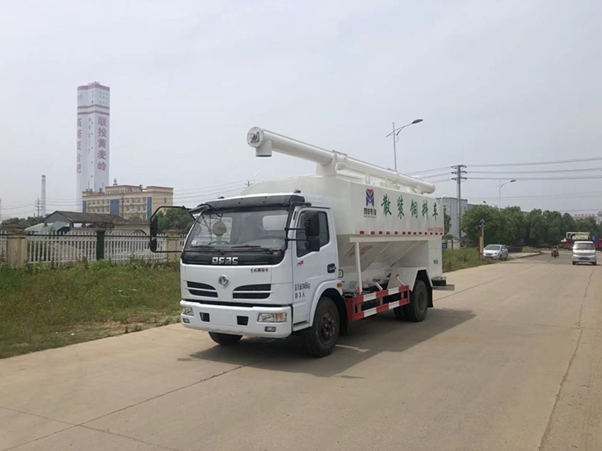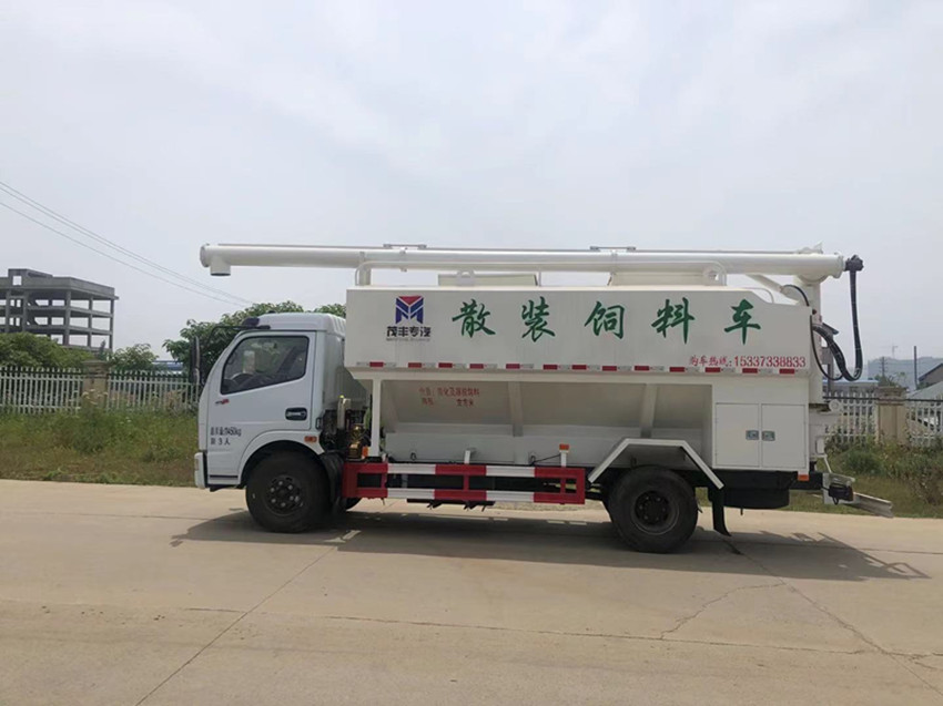 散裝飼料運(yùn)輸車,散裝飼料車的飼料罐架設(shè)在卡車的底盤上,罐頂開有進(jìn)料口.頂部的一根螺旋輸送卸料管(俗稱卸料絞龍)則可自由回轉(zhuǎn)和抬升,抬升的仰角可達(dá)60度。運(yùn)輸時(shí),頂部的螺旋管平臥在罐頂;卸料時(shí)則抬起,使管端的出料口與畜禽飼養(yǎng)場(chǎng)貯料罐頂部的進(jìn)料門相接,駕駛室內(nèi)裝有操縱裝置(操縱裝置也可裝置在罐體尾部),卸料時(shí)通過車底的動(dòng)力輸出軸和減速器來驅(qū)動(dòng)螺旋,以完成卸料。